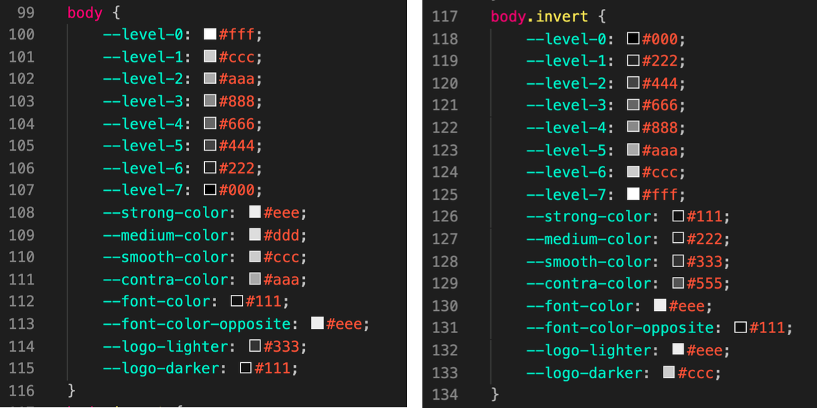 To decide which range is applied to the interface, CSS variables containing the colors are applied to different classes of the "body" element of the HTML document. If the "body" does not have a class defined, by default the interface is clear, however, when we add the class "invert" it becomes black, this happens because we overwrite the variables with those colors and automatically all the elements of the interface change.