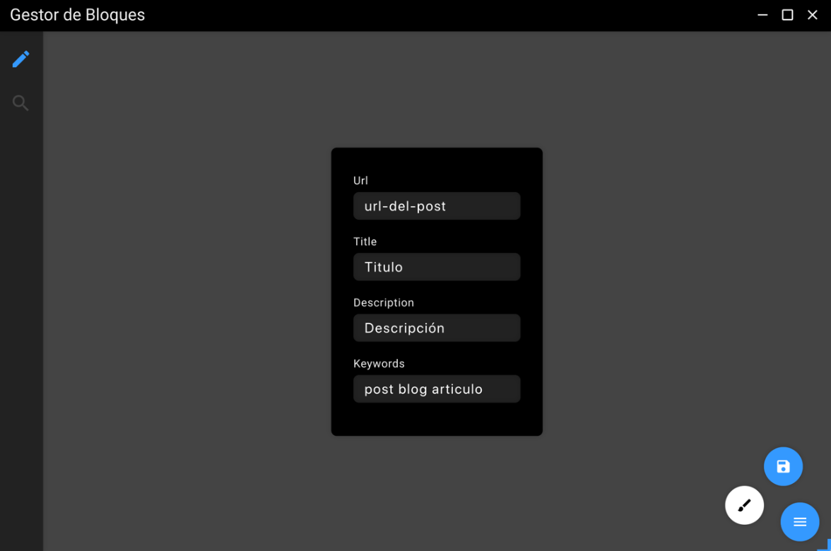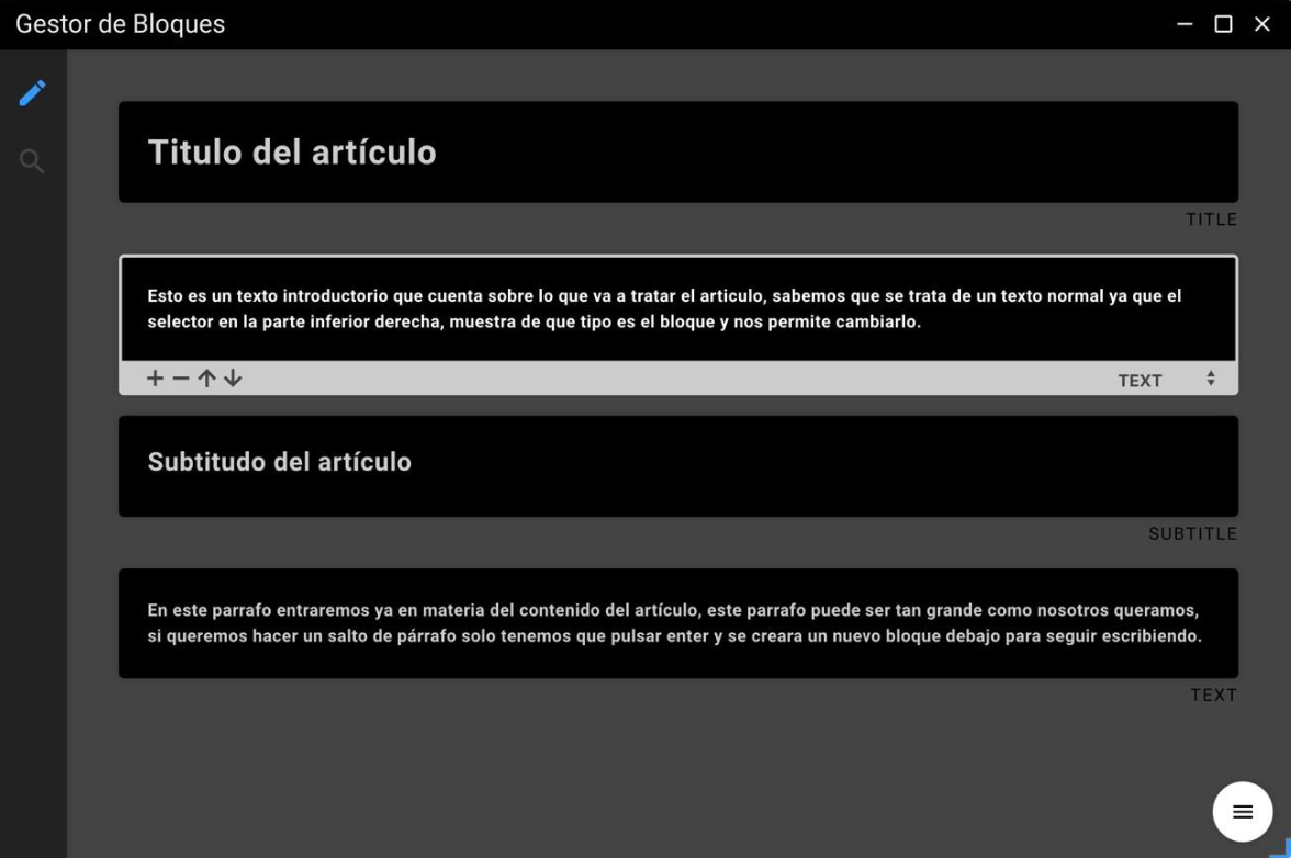 A content manager must have a text editor that provides its users with a simple interface where to write. The module in charge of this is called "editor", it has been designed following a block structure, hence the name "block manager", in which each element to insert content is a block. Each of these blocks consists of two elements, the text of the block and its type.