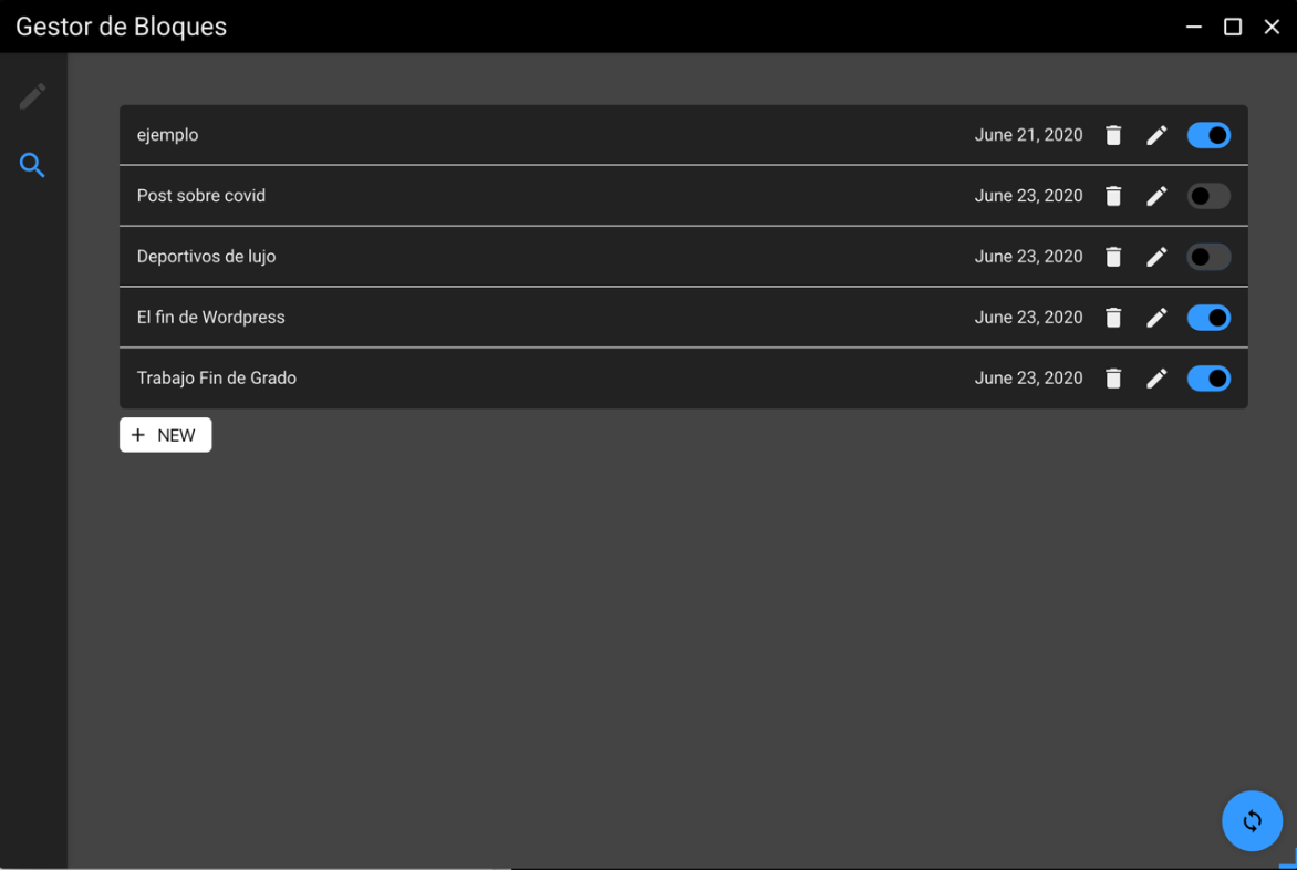 To start the synchronization, click on the synchronize button located at the bottom right of Figure 16. Each of the existing pages in the manager is scrolled, if they have the property "online" with the value true, the corresponding HTML file is uploaded to the server. This upload only occurs after verifying that the file is not already on the server, we know this by another property other than the JSON that indicates whether it has been uploaded to the server at some point, or if it is on the server and comparing the date on which it was uploaded with the date of the last modification of the article, this last one is more recent than the previous one. All items that are as online we store them in an array for the construction of the main page of the blog.