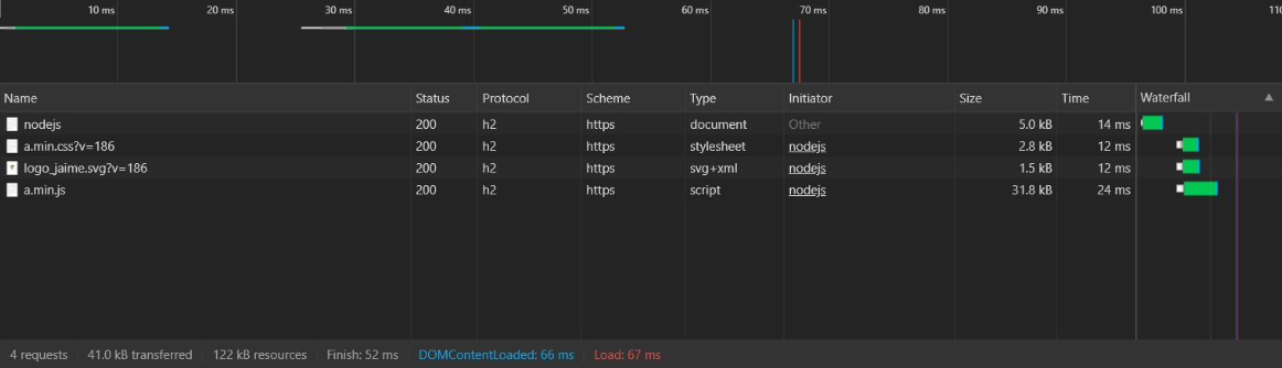 As far as the number of requests is concerned, by using code made by and for this page I can reduce the number of files needed and optimize its compression which means fewer requests to the server and smaller size. WordPress, on the other hand, loads a number of resources defined by the manager itself and the template used, this being one of the "lighter templates". The difference is appreciable, going from ten requests to four. With this optimization, the data transferred is reduced by 80%, 122 kB of resources on my web page while WordPress is transferring 582 kB since, in addition, it is transferring more code than necessary to display this specific page. This difference in transferred resources, as the website becomes more complex, will become more relevant, thus obtaining better response times than a conventional WordPress site.