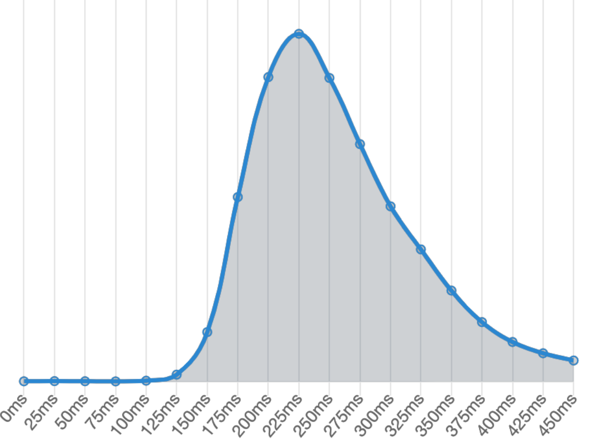 The graph shown in Illustration 21, shows the response time of a human being to an element that requires interaction, it has been obtained by taking 81 million samples and the average is 284 ms. This implies that interactions with my web page do not require waiting on the part of the user, having obtained a time of 52 ms of graphic representation (Finish), the user will not have to wait for a content to load before interacting with it. The video standard, 24 frames per second, shows us that the human eye can not appreciate jumps below 42 ms, so the loading time between the end of downloading the HTML (14 ms) and the time it takes to display the entire page (52 ms) gives a difference of 38 ms, which would be approximately 0.9 frames, is not noticeable, giving the feeling of an "instant" load. This same in the loading of WordPress if it is appreciable, since the time between downloading the HTML (76 ms) and the Finish (369 ms) gives a difference of 293 ms that would be approximately seven frames, so the human eye would notice the difference. In a simple page these data in both cases are low, but, as the complexity increases, the difference in time is much more relevant.