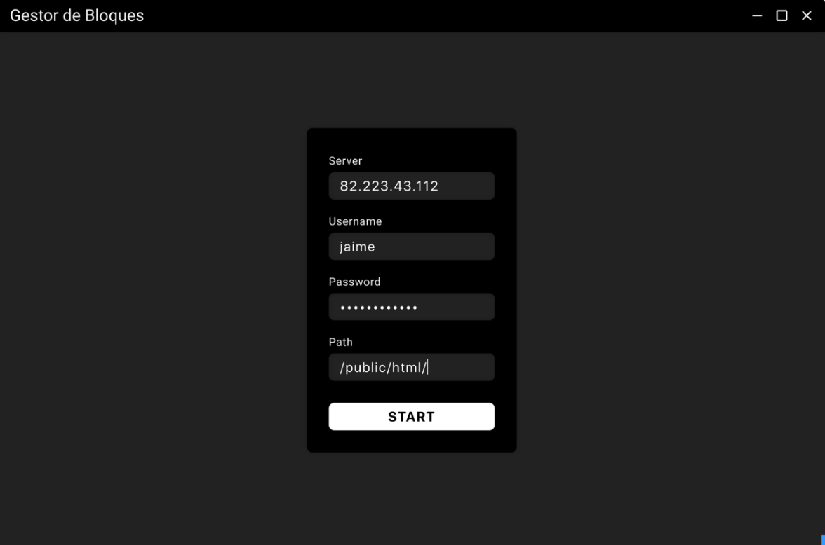 When the user presses the "START" button, the application proceeds to establish an SSH connection with the server, this connection is achieved by using the "node-ssh" library of NPM. The first thing we do is to execute the "ls" command in the directory specified by the user and check that there is not already a folder called "blog", which is the name of the directory used by the application. As we are setting it up for the first time on a server where this application has never been connected, this directory will not exist, so by SSH we create the directory with another directory inside called "data", which we will use to store the login credentials. Finally, before finishing this process, we generate a JSON file that we will store locally with the data entered by the user, this way the next time we enter the application, before asking for them, it will check if they exist in this file, in case they do, it will skip this step and will read the JSON to have the credentials and to be able to establish the communication.